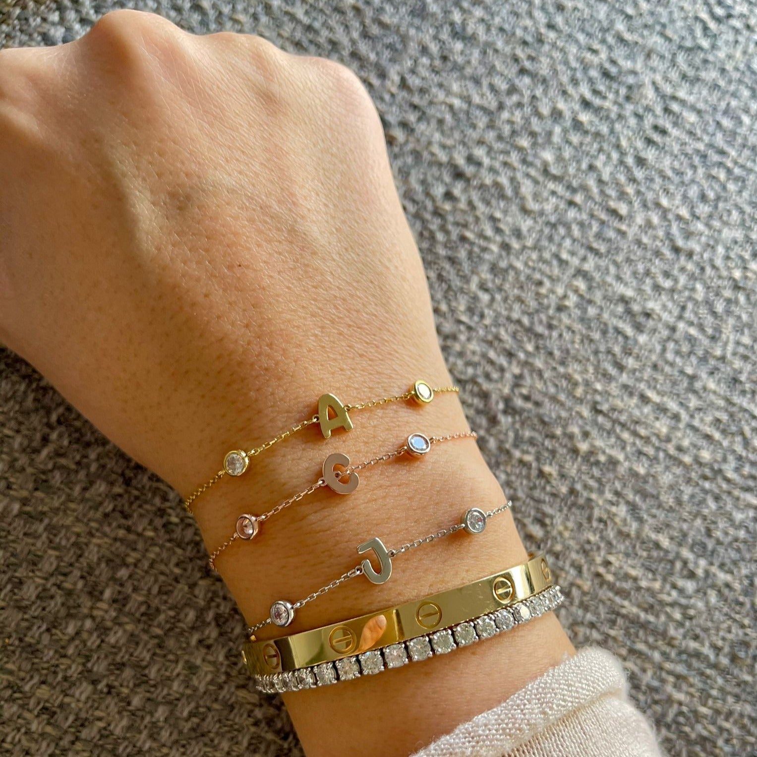 A charming and personalized accessory that adds a touch of elegance to your wrist. A bubble-shaped initial pendant and a delicate chain with 2 bezels adds a unique and eye-catching touch, making it perfect for personalizing with your initials. The minimalist design ensures versatility, whether you're dressing up or keeping it casual.