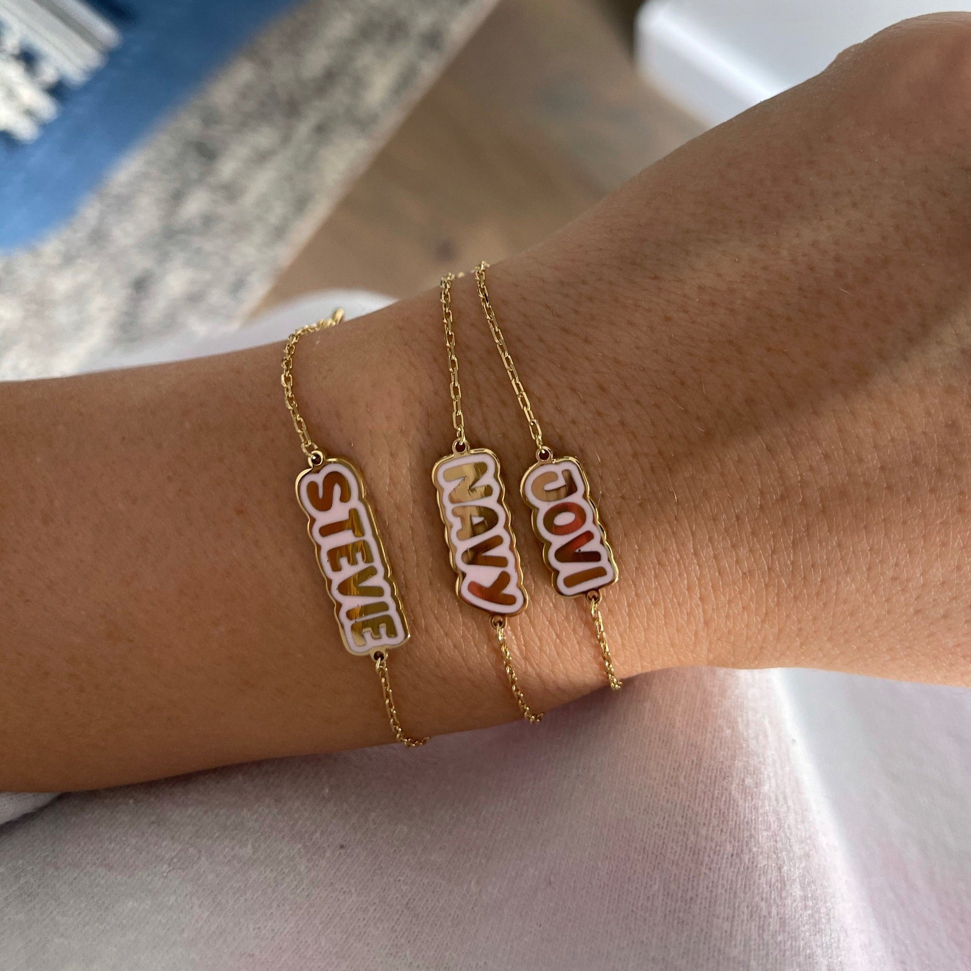 This bracelet is meticulously crafted from high-quality materials, featuring your name or a special word in a bold and fun 'bubble' font, adorned with vibrant enamel. It's more than just jewelry; it's a symbol of your unique personality.