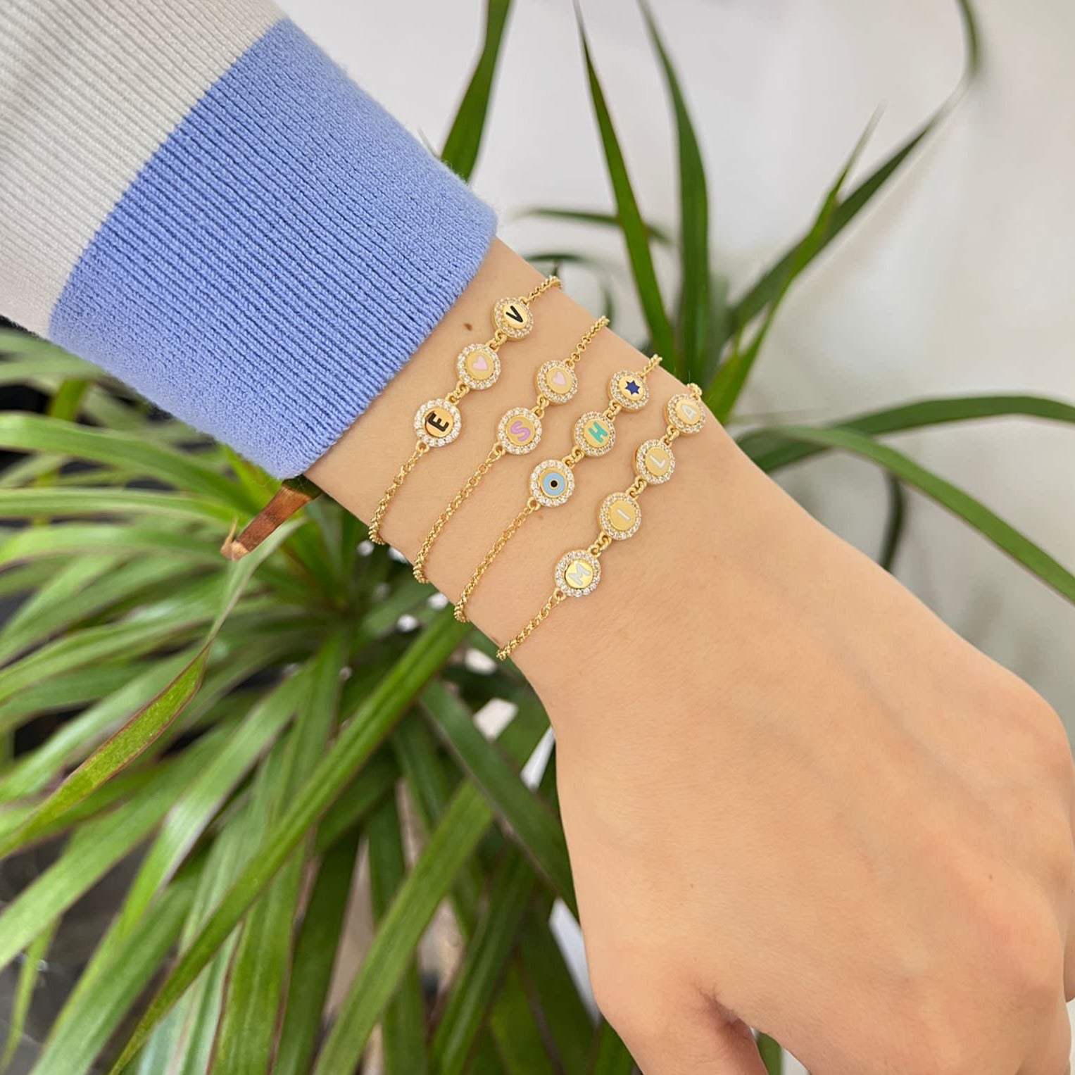 Meet the Enamel Initial Disc Bracelet in sterling silver – a cool accessory with a personal twist.