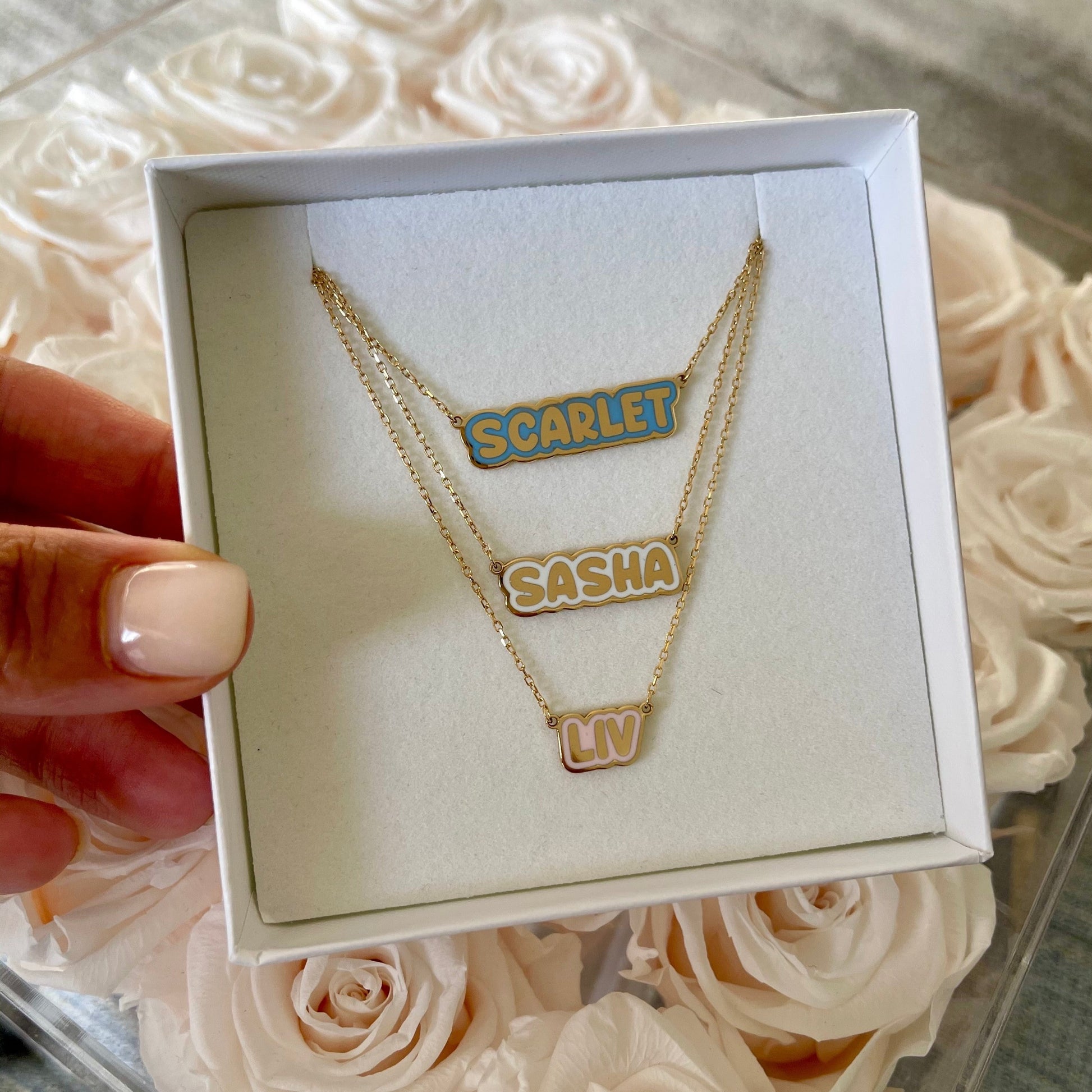 Join the trend and make a statement with our Scarlet Enamel Bubble Nameplate Necklace. Order yours today and experience the allure of personalized chic.