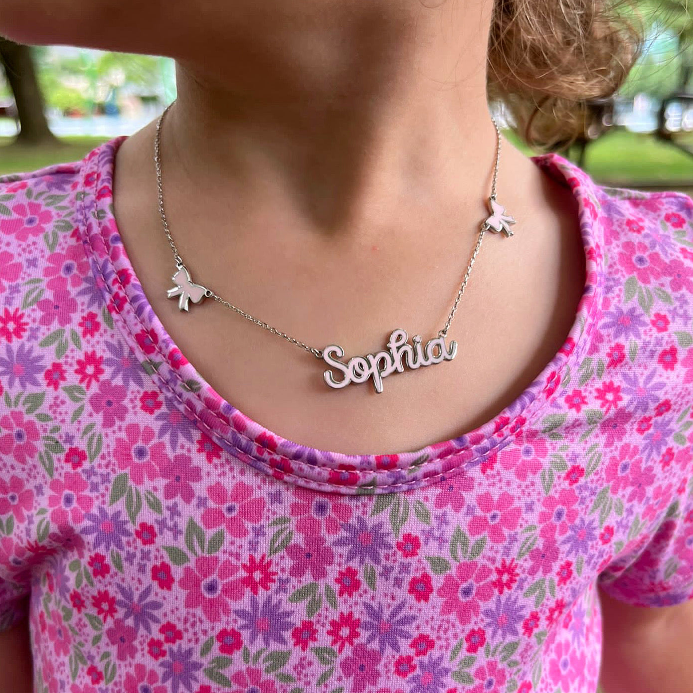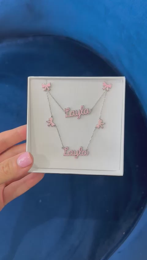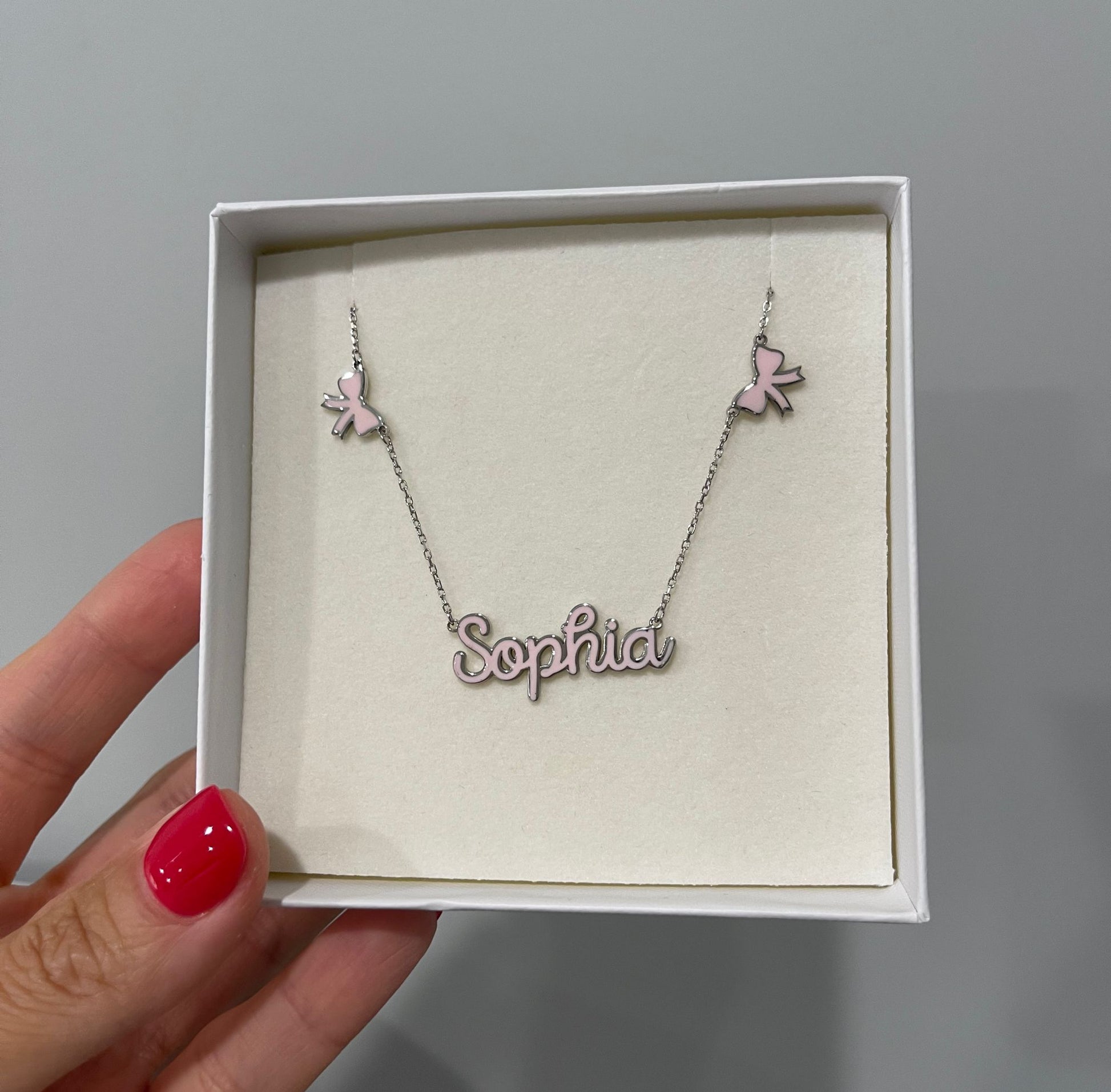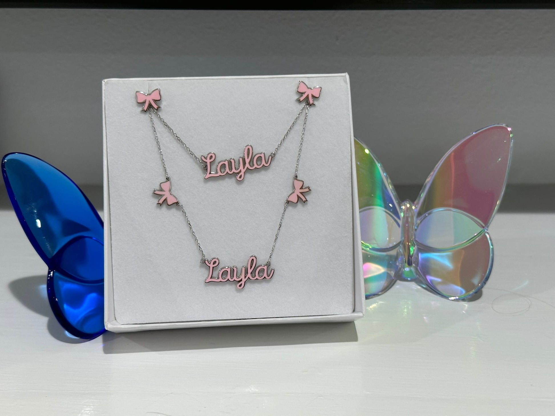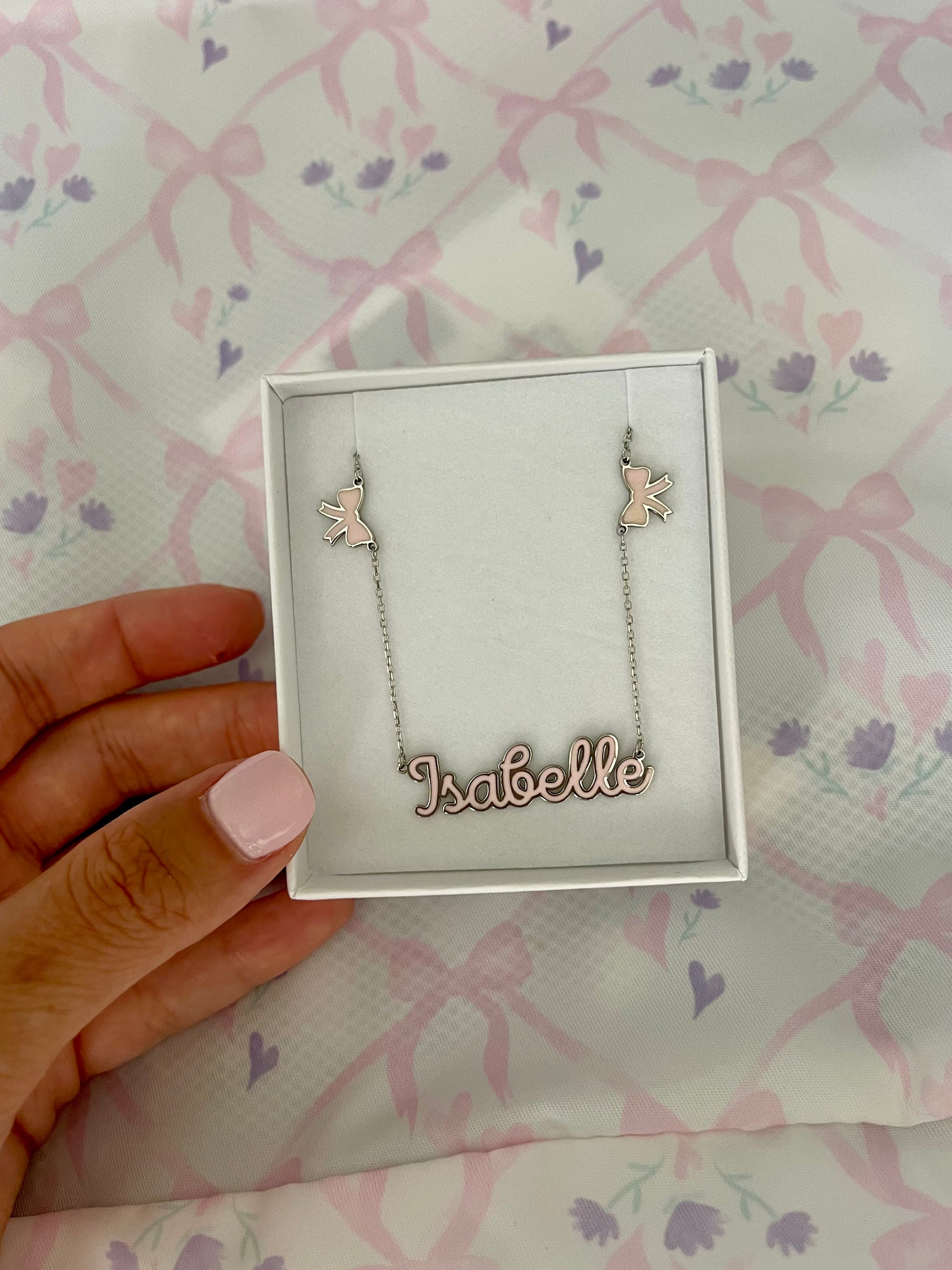 A delightful and personalized piece that beautifully combines script elegance with charming bows, perfect for young girls. The design effortlessly blends timeless script with playful bows, making it perfect for young girls to showcase their individuality with grace.