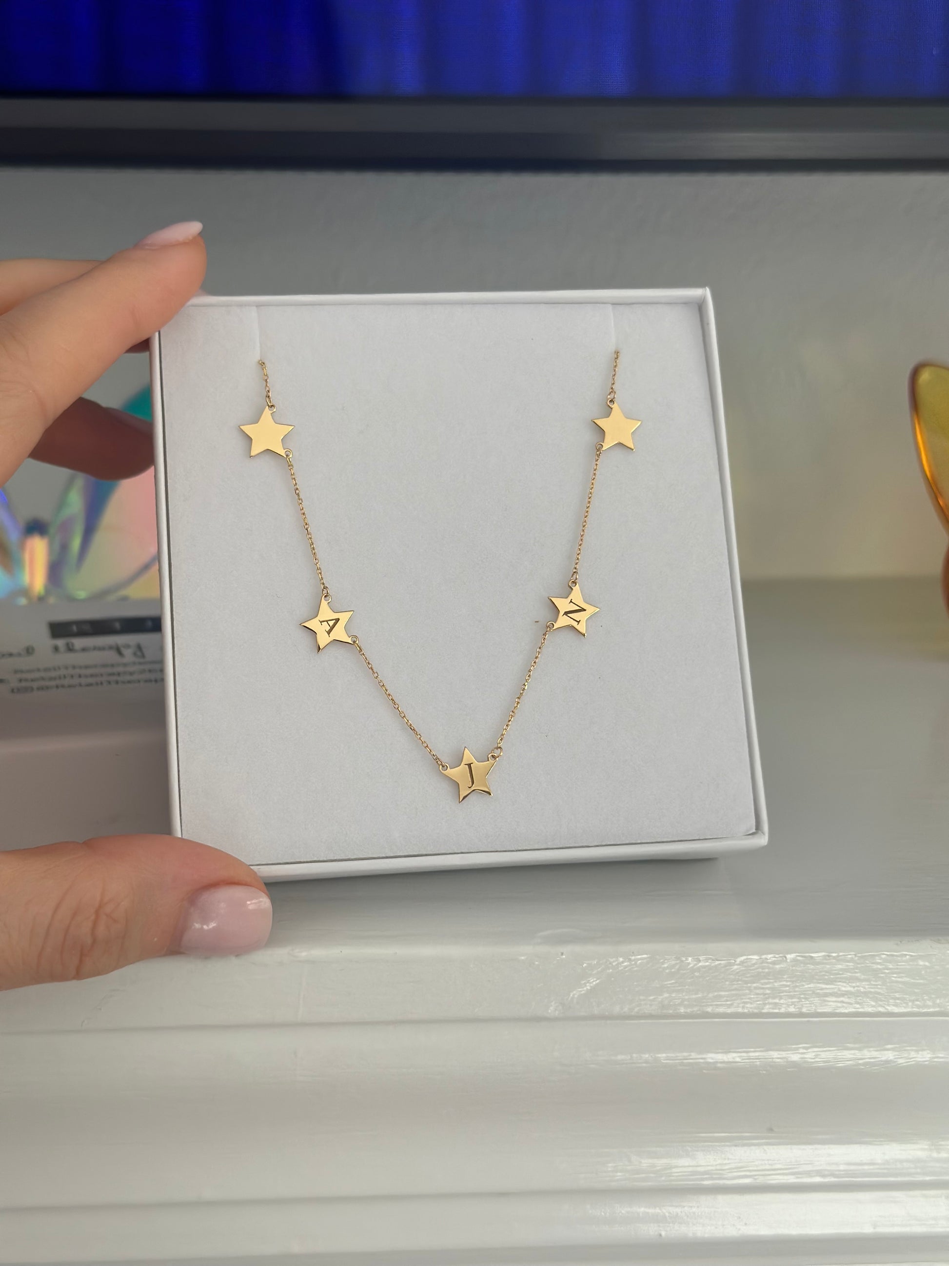 Shine bright with our Star Initial Necklace, where your chosen initials are elegantly set within the stars. Crafted with high-quality materials for lasting beauty, this piece is both personal and eye-catching. Perfect as a thoughtful gift or a stylish everyday accessory, it’s a timeless way to wear what matters most.